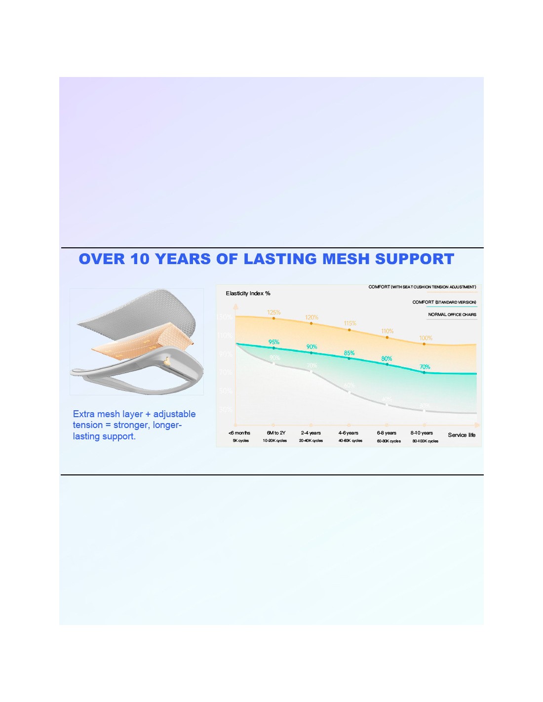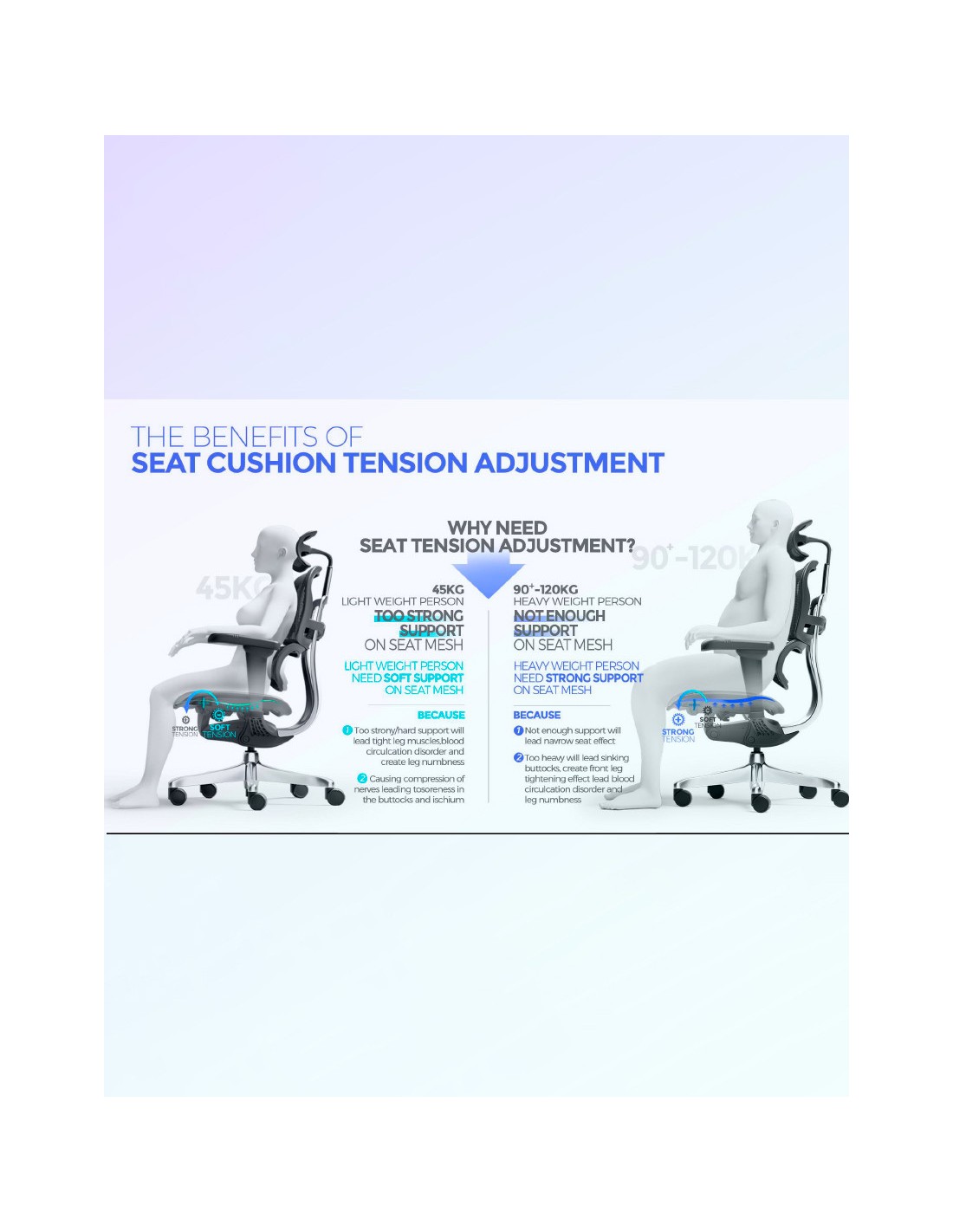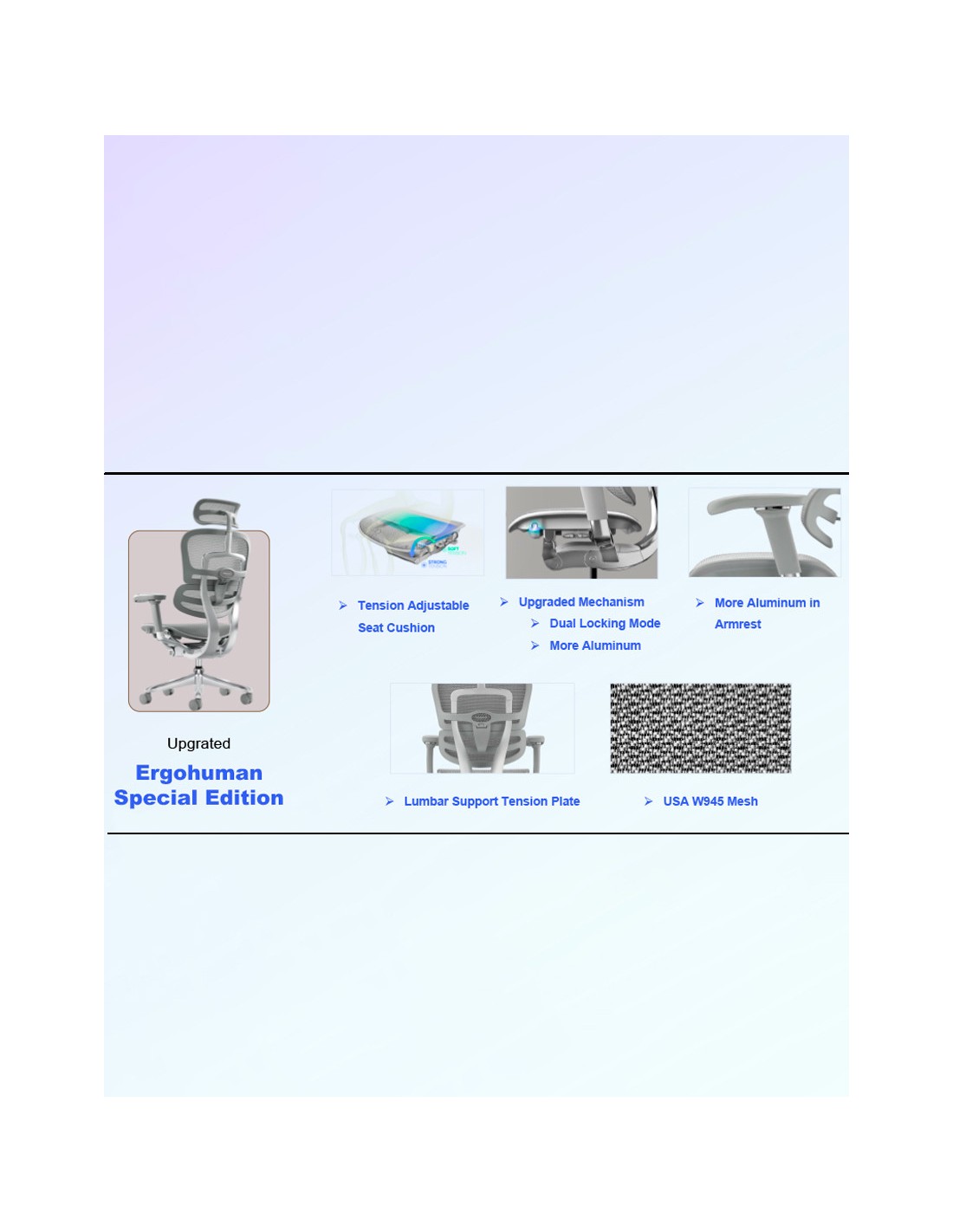 Країна: Шотландія. Серія ERGOHUMAN LUXURY 2 поповнилася ще одним ексклюзивним кріслом, яке в технічному плані взагалі не має аналогів серед інших відомих виробників крісел. Революційний прогрес у 2025 році - регульована за натягом сітка на сидінні, що значно підвищує ергономіку крісла в цілому і покращує комфорт користувача. Основа: алюміній. Сітка: W945-01, чорного кольору (100 тис. циклів). Клас: hi end, А +. Механізм: синхронний, Single Level Control Mechanism. Регулювання: висота крісла, глибина сидіння (слайдер-механізм), висота спинки, фіксація нахилу спинки (х5), вибір кута вільного гойдання, жорсткість поперекової підтримки, жорсткість гойдання, регулювання натягу сітки сидіння. Підлокітники 5D. Підголівник: 2D. Навантаження: 125 кг. Гарантія: 5 років.